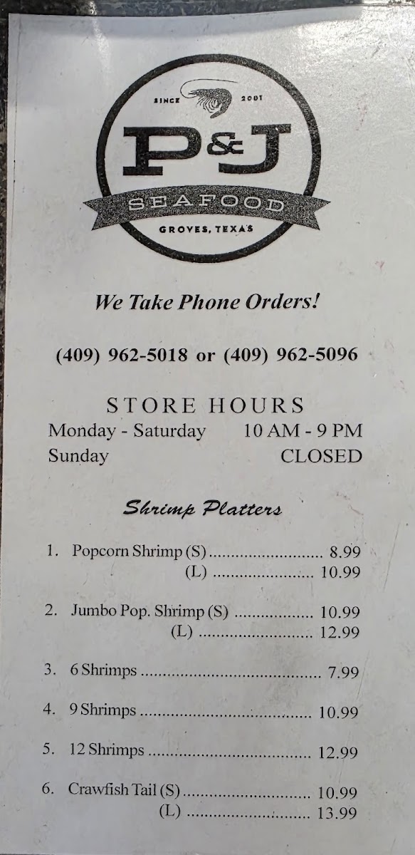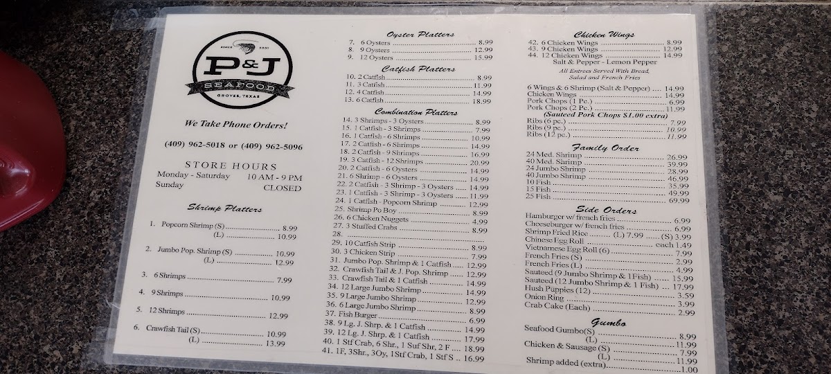 Introducing P & J Seafood, nestled in Groves, TX, where freshness meets flavor. Known for their exceptional shrimp platters, including the popular Popcorn Shrimp Plate and options for family orders, this seafood haven ensures that every meal is crafted just for you. Customers rave about the meticulous preparation, with everything made to order, right down to the fries.